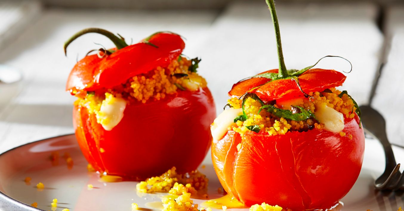 Se spală roșiile și se taie sfertul de sus cu codița ca un capac. Roșiile se scobesc cu o lingură, se perforează pielița de jur împrejur cu o scobitoare, se umplu cu cușcuș și se așază capacul pe acestea.