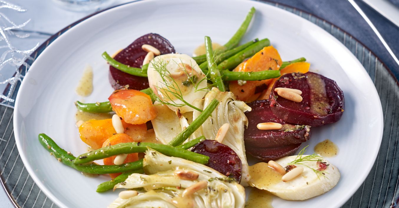 Semințele de pin se rumenesc fără ulei într-o tigaie antiaderentă. Legumele se lasă să se răcescă, se așează în farfurii, se stropesc cu dressing și se servesc cu semințe de pin presărate pe deasupra.