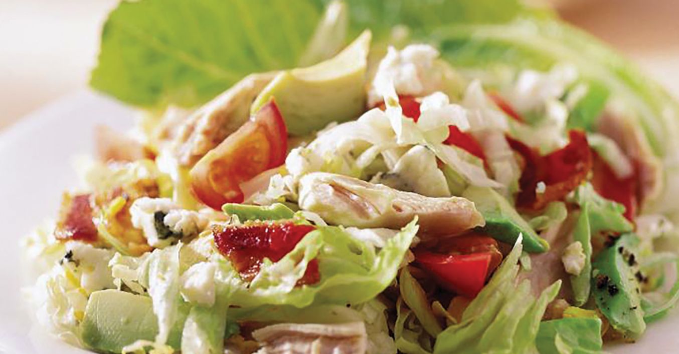 Se combină într-un castron mare salata tocată fâșiuțe, puiul tocat, roșia tăiată cubulețe, brânza, ouăle tocate, avocado tăiat cubulețe și baconul.