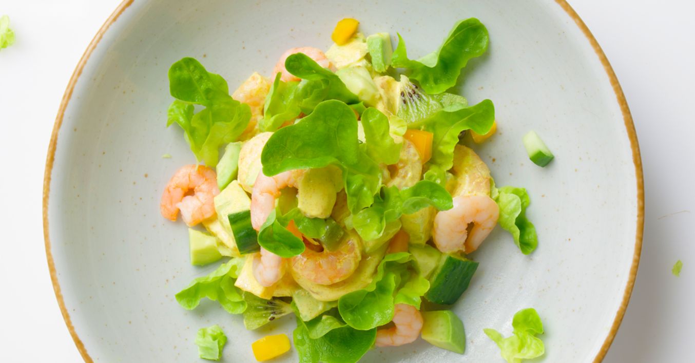 Creveții, cuburile de avocado, ardeiul gras, fructele de kiwi și castravetele se marinează cu sosul de lămâie și curry. Înainte de servire se încorporează salata.