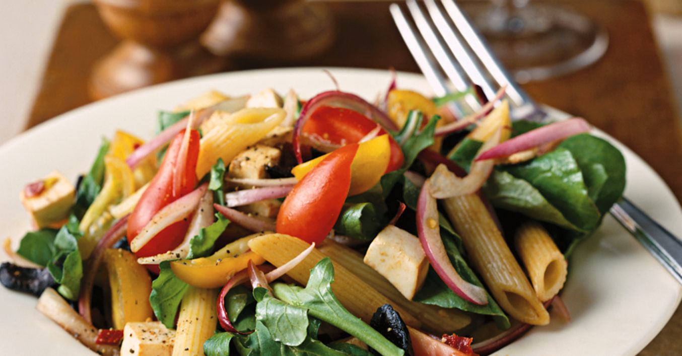 Salată de paste cu rucola, roșii și cașcaval afumat