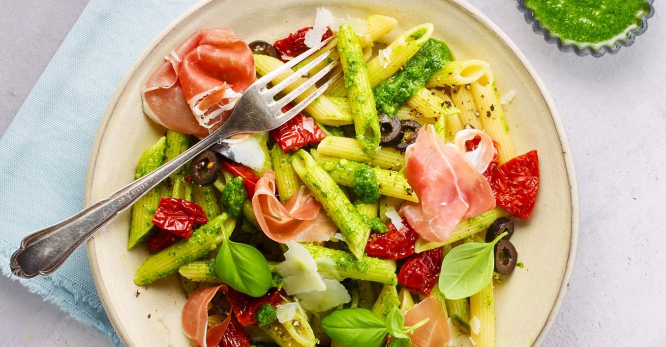 Paste se fierb la foc mic conform instrucțiunilor de pe ambalaj, în apă cu sare, până devin „al dente“. Roșiile și șunca de Parma se taie în felii, iar măslinele rondele.