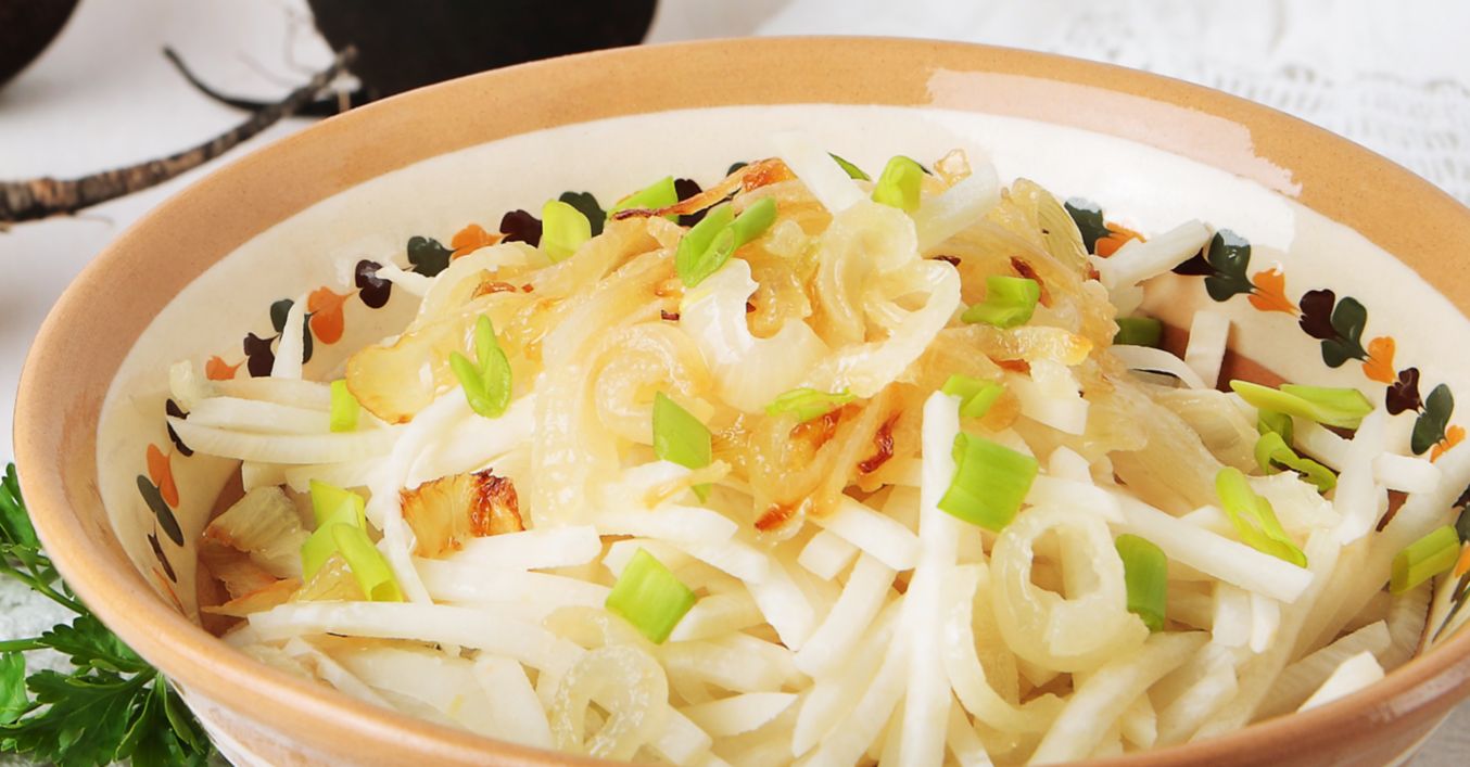 Curăță cepele, taie-le fâșii și călește-le într-o lingură de ulei. Pune ceapa calită peste ridichi, iar apoi adaugă uleiul, oțetul, sarea și piperul.