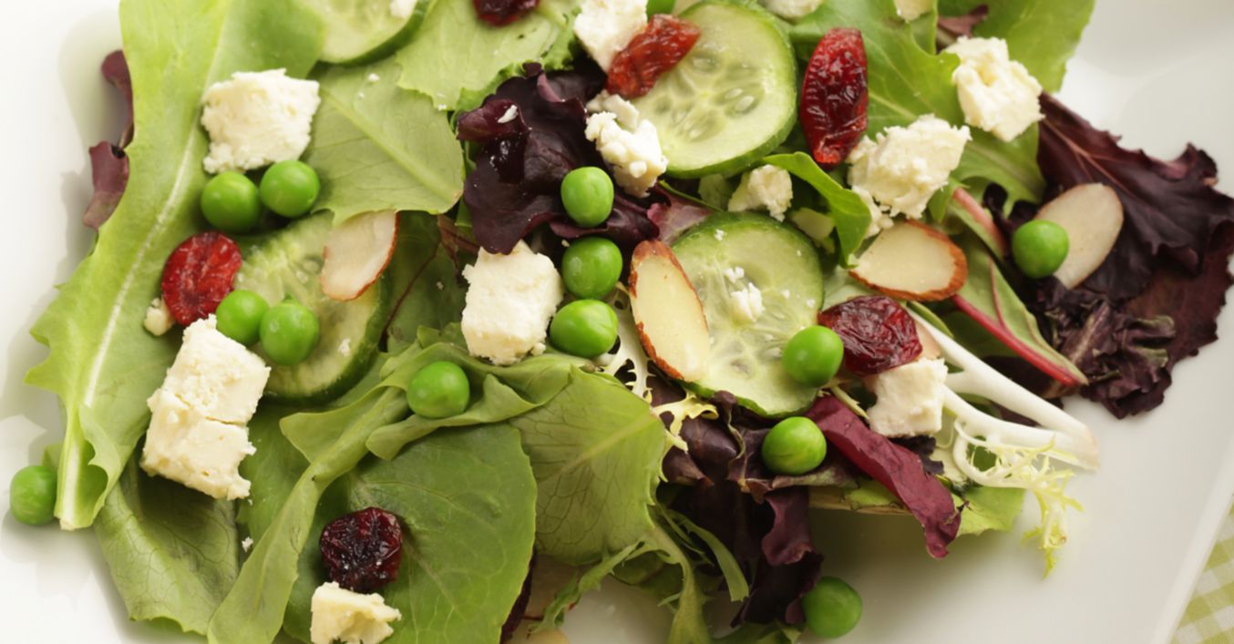 Se rup frunzele de salată și se pun pe un platou. Se adaugă mazărea, castraveții tăiați rondele și stafidele. Se presară sare și piper și se stropește cu suc de lămâie și ulei de măsline. Se amestecă ușor și se presară cubuleție de parmezan.