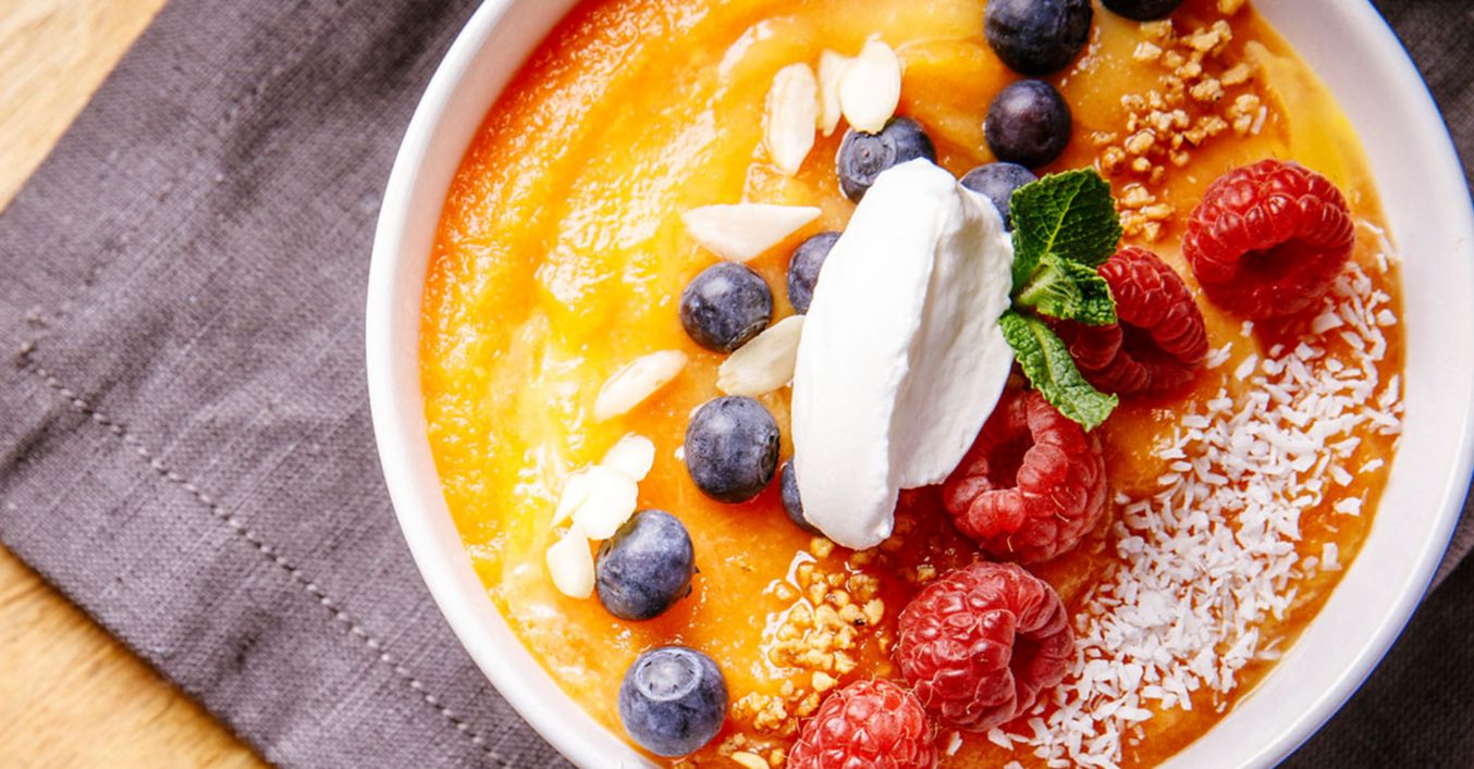 Fructele coapte se introduc într-un blender cu gheața și apa minerală rece și se amestecă până se obține o cremă.
