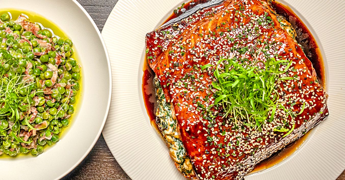 Închidem somonul și îl ungem pe deasupra cu sos teriyaki.