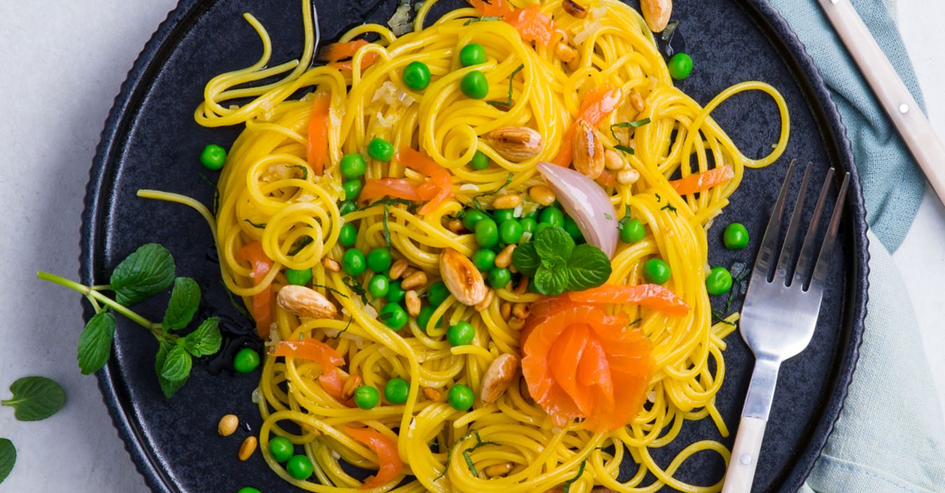 Se încălzește jumătate din uleiul de măsline în tigaie și se călesc în acesta usturoiul și cepele, aprox. 2 minute. Se adaugă pastele și puțină apă de la fiert pastele. În final se încorporează somonul, menta și mazărea și se condimentează cu sare și piper. Spaghetele de somon se amestecă cu restul de ulei de măsline și se ornează cu semințe de pin și migdale.