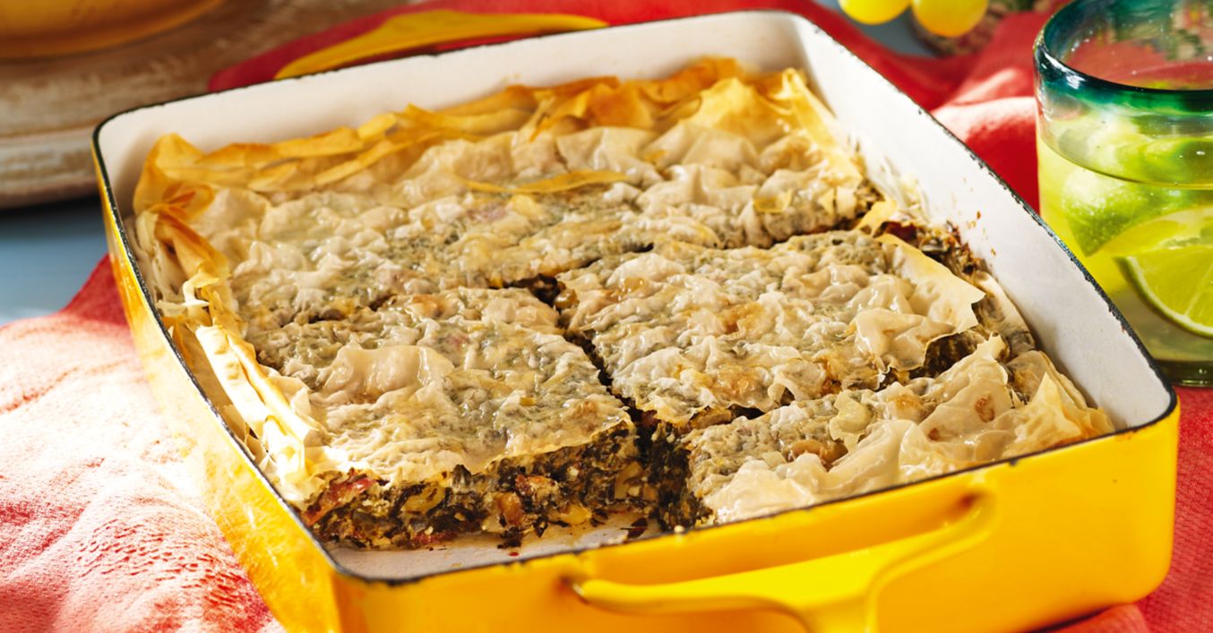 Se unge cu puțin ulei o tavă de copt puțin adâncă, de 28 x 20 cm. Se pun două foi de aluat dezghețat în prealabil pe fundul și pe marginile tăvii, suprapunându-le dacă este nevoie. Se lasă aluatul în exces să atârne peste marginile tăvii. Se acoperă cu jumătate din amestecul de spanac, întinzându-l către margini în strat egal. Se acoperă cu altă foaie, apoi se adaugă alt strat din amestecul de spanac.