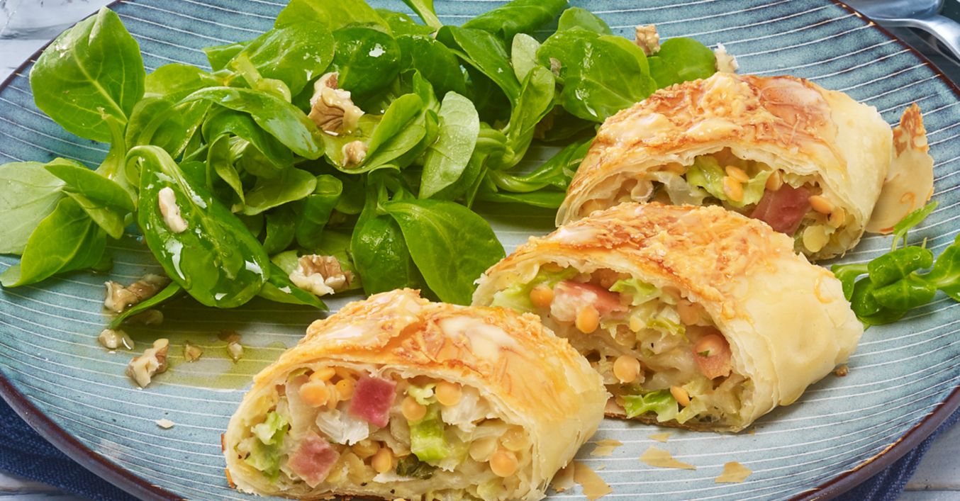 Se spală salata. Pentru dressing, amestecă uleiul și oțetul, asezonează cu sare, piper și zahăr și amestecă sosul cu salata. Presară nucile peste salată, taie ștrudelele bucăți și servește-le cu salată.