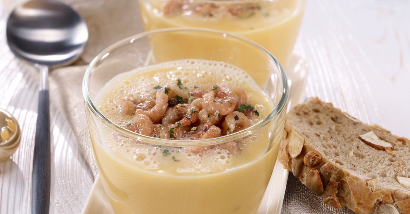 Se pasează supa, se rafinează cu Mascarpone, se condimentează cu sare, piper, ienibahar și cardamon și se toarnă în pahare termorezistente. Crabii se adaugă ca topping și se servesc după dorință cu pâine cu nucă.
