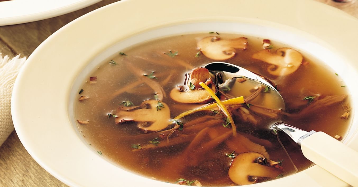 Când orezul este fraged, se adaugă ciupercile și se asezonează cu nucșoară, sare și piper, după gust. Se servește supa fierbinte, garnisind fiecare bol cu coajă rasă de lămâie și frunze de cimbru.