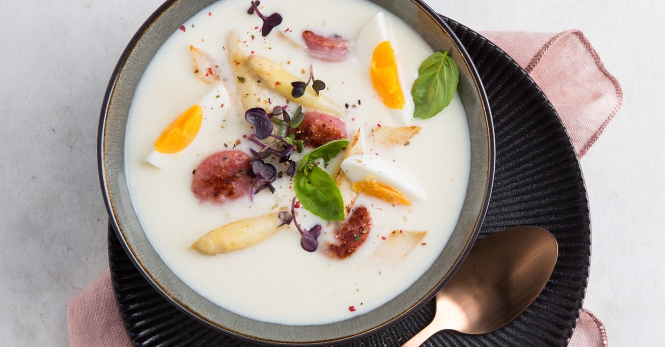 Ouăle se curăță de coajă și se taie în opt bucăți. Supa se pasează fin, se rafinează cu smântână, sare, piper și nucșoară măcinată și se servește cu amestecul de cârnați salsiccia și sparanghel, precum și, după gust, cu germeni de ridiche roșie și câteva frunzulițe de busuioc presărate deasupra.