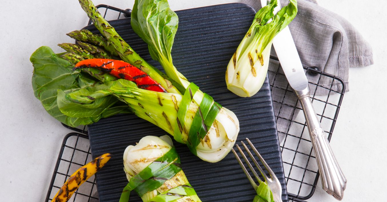 Sparanghelul verde, varza chinezească și ceapa verde se curăță și se spală. Varza chinezească se separă de frunze. Ceapa verde se taie în lungime, în fâșii și se opărește în apă clocotită cu sare aprox. 1 minut, astfel încât să se poată îndoi mai ușor.